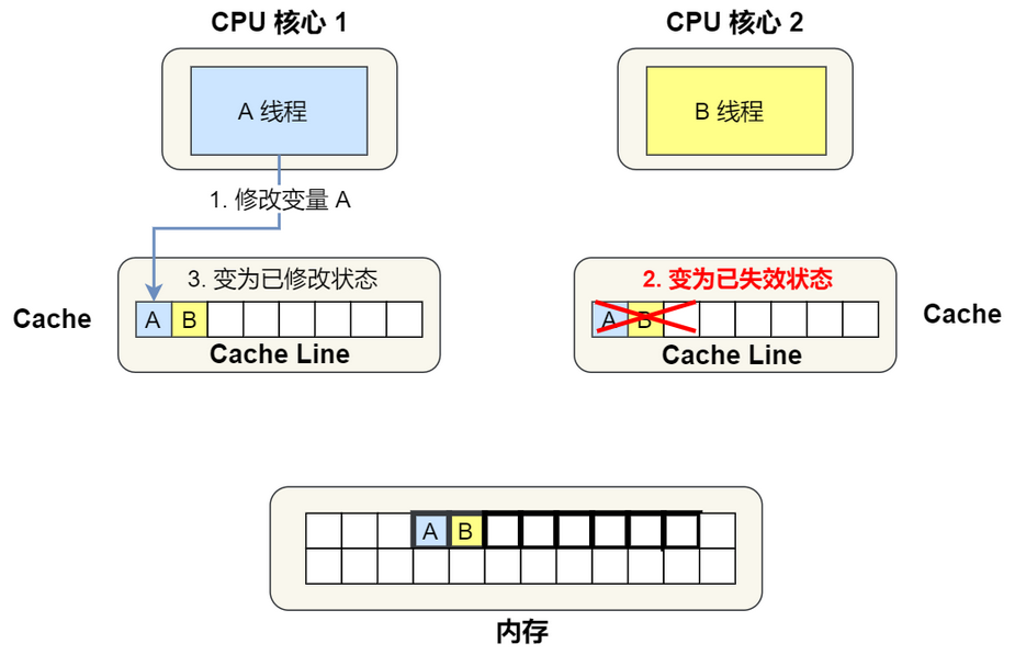 CPU1和CPU2缓存都有AB数据,只要一方修改了A或者B,就会导致对方缓存数据失效,虽然保证了缓存一致性,却失去的一定的性能。这就是所谓的伪共享问题。