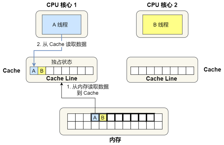 - CPU核心1从主存中加载一个缓存行,并标记该缓存行的独占状态